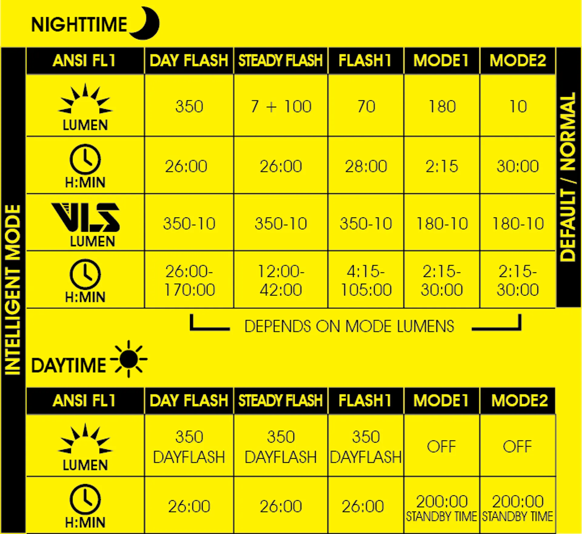 • 5 modes: DAY FLASH / STEADY FLASH / FLASH 1 / MODE 1 / MODE 2