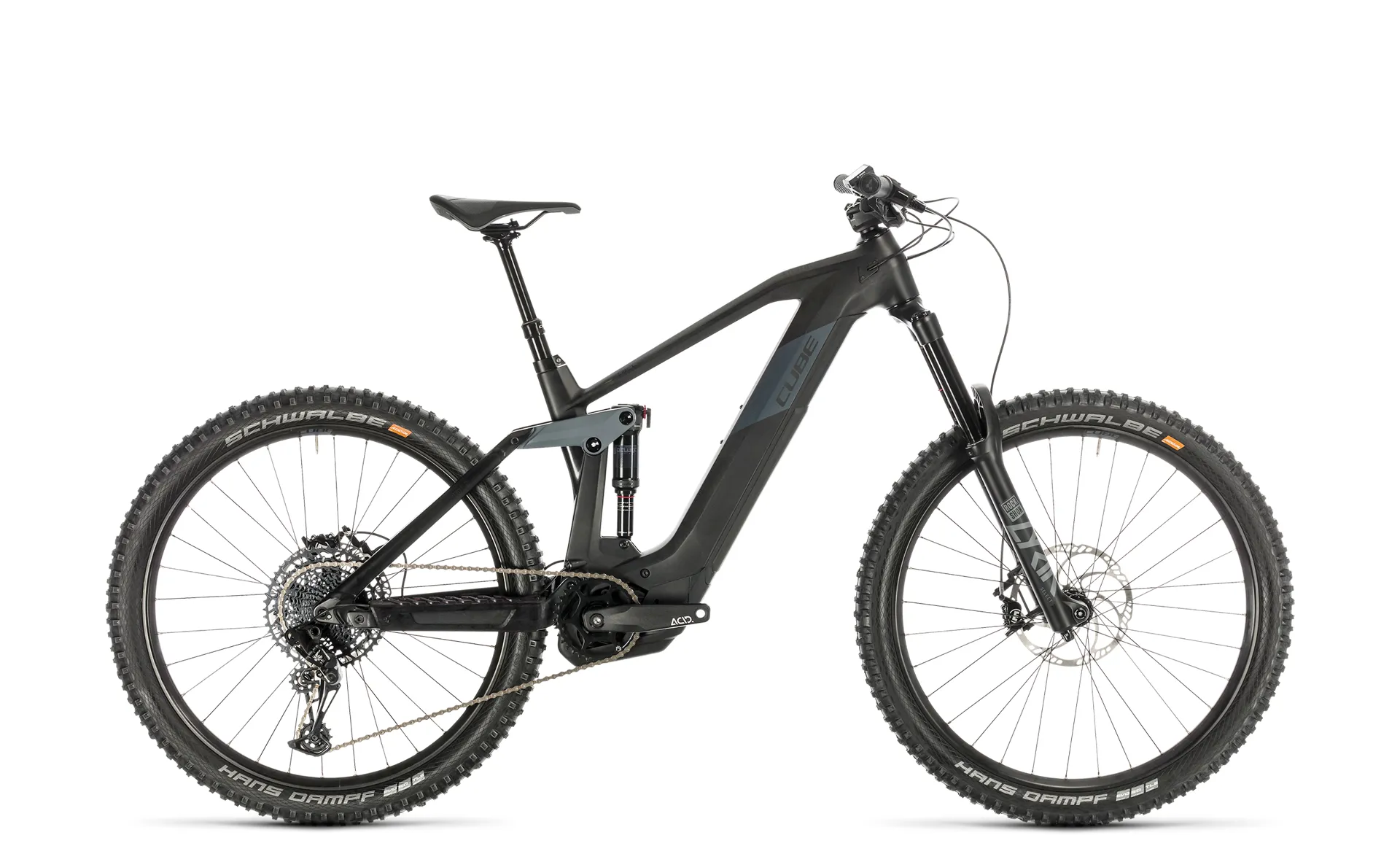 Building a world-beating enduro bike isn't easy. Building one that combines genuine enduro performance with the ease of use of Bosch's amazing drive system is even harder. Luckily, CUBE's years of experience at the Enduro World Series, as well as building class-leading Bosch e-bikes, helps make the job a tiny bit easier. Our engineering team was able to draw on their extensive hybrid, carbon and full suspension design experience to create something remarkable: a 160mm travel bike with carbon main frame, progressive suspension kinematics and an aggressive geometry designed specifically for 170mm forks and tough enduro courses, plus seamless Bosch power. The new CUBE Modular Battery System encloses the Bosch power unit in the down tube, hidden behind a shock-, moisture- and dust-proof cover that features a push button for access, as well as a hidden lock. It's not just neat, it also enables us to increase the battery's capacity for even greater range out in the mountains. Larger bearings, hidden cable routing, chain guide compatibility and space for a bottle cage mount are just some of the details that set this bike apart. As for the spec, it would have been easy to cut a few corners... but that's not the CUBE way. So you'll find a RockShox Deluxe Select+ shock and matching RockShox Lyrik Select fork up front, working together to deliver up to 170mm of boulder-swallowing travel. A remote dropper post opens up new line choices, while Sram's NX Eagle 12-speed transmission ensures you can ride every bit of the link stages. And Magura MT Fifty hydraulic disc brakes, combined with big-volume and super-grippy Schwalbe Hans Dampf tyres, give you all the power you need to control your speed on the timed stages. Combined with Bosch's fourth-generation drive unit, it's all the excuse you need to head out into the mountains and smash out some new personal bests. Are you ready? Because the Stereo Hybrid 160 HPC SL definitely is.