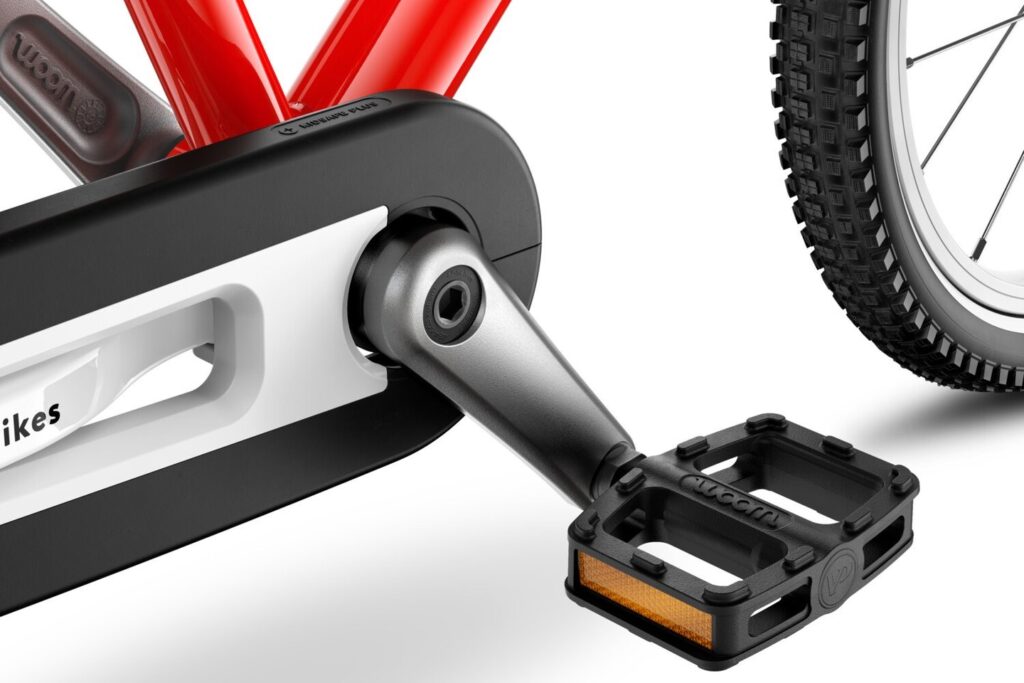 And we couldn’t forget our specially developed cranks, with the crank arms shorter to match a child’s leg length and the distance between the pedals smaller to allow for children’s narrower hips. This protects the knee joints since the knees won’t have to bend as much when pedalling.